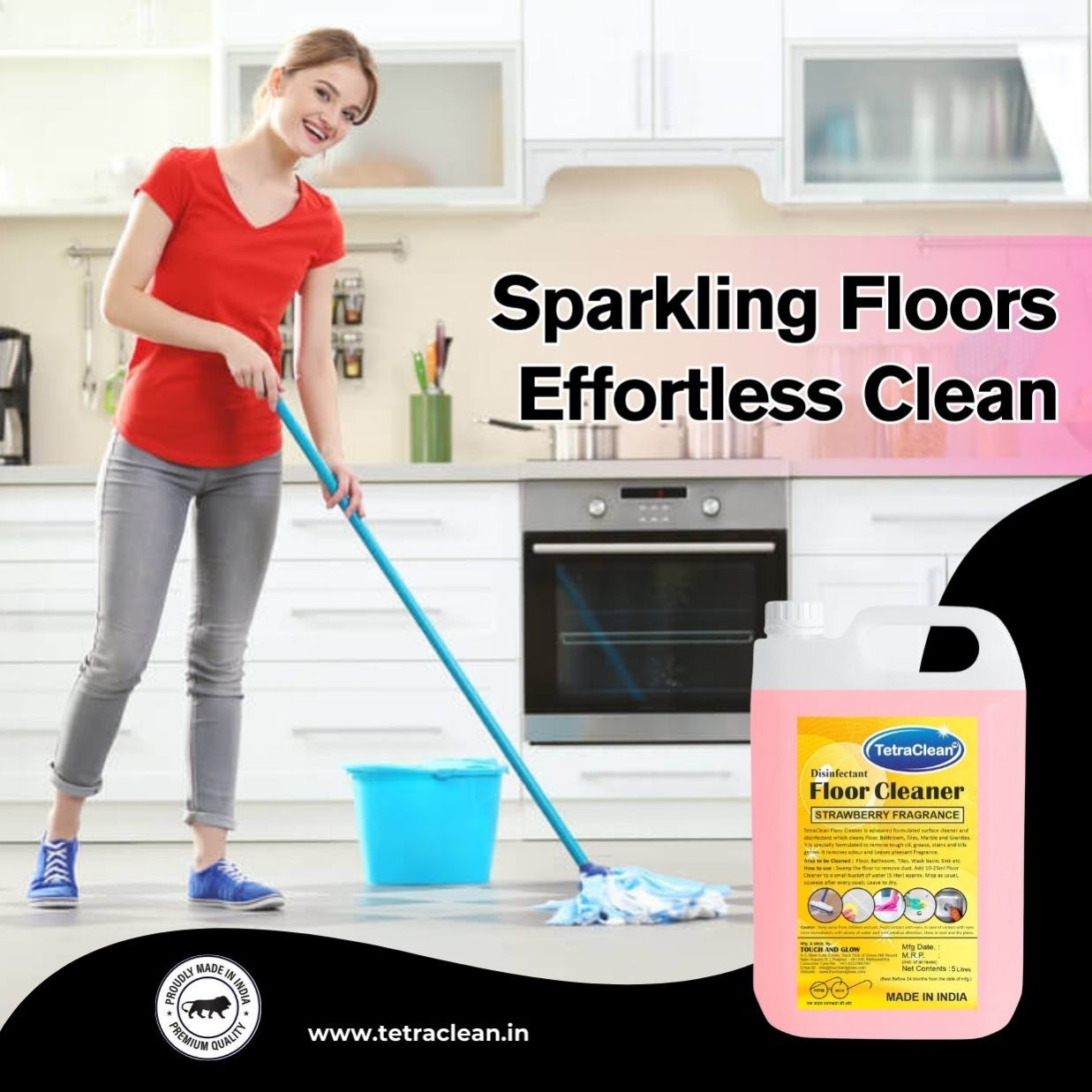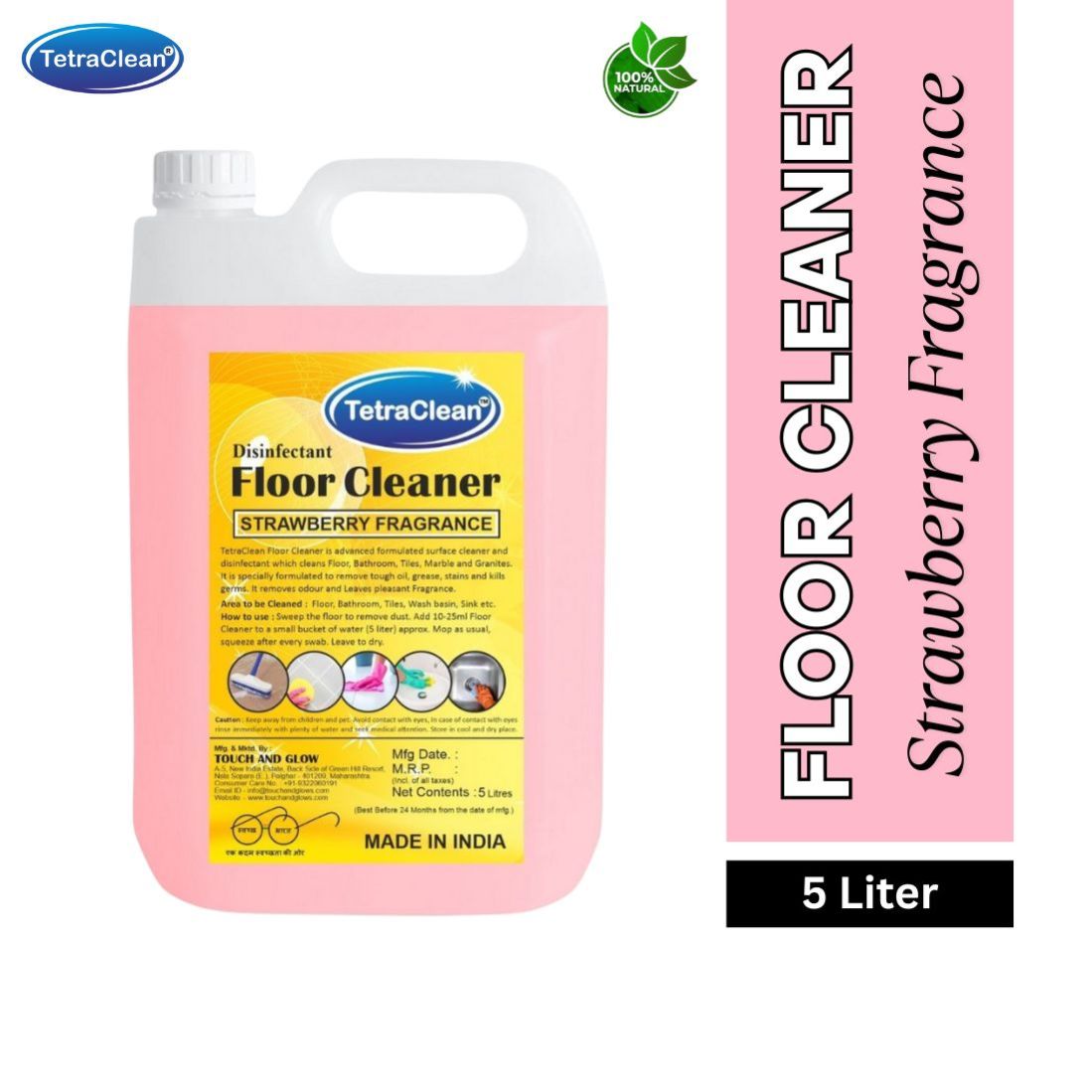 TetraClean Disinfectant Floor Cleaner is an advanced formulated surface cleaner and disinfectant designed to give your home and workplace a hygienic, spotless shine. It effectively removes dirt, grease, tough stains, and grime while eliminating 99.9% of germs and bacteria, ensuring a safe and healthy environment for your family.