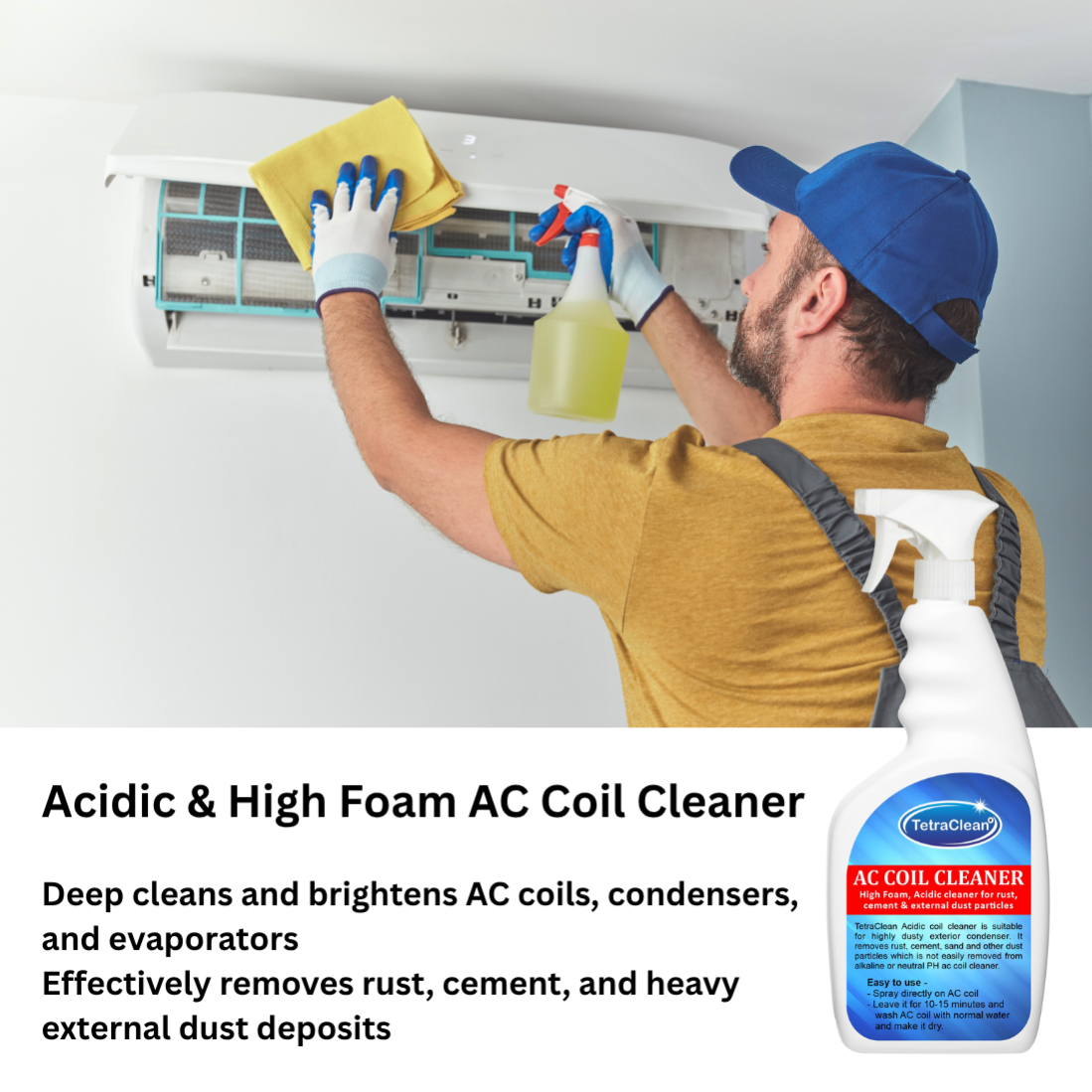 TetraClean Acidic & High Foam AC Coil Cleaner is a professional-grade formula designed to deep-clean exterior condensers and coils covered with rust, cement, and tough dust deposits. Its high-foaming acidic action penetrates deeply, reacting with metal oxides and dust buildup for effective removal without damaging the coils.