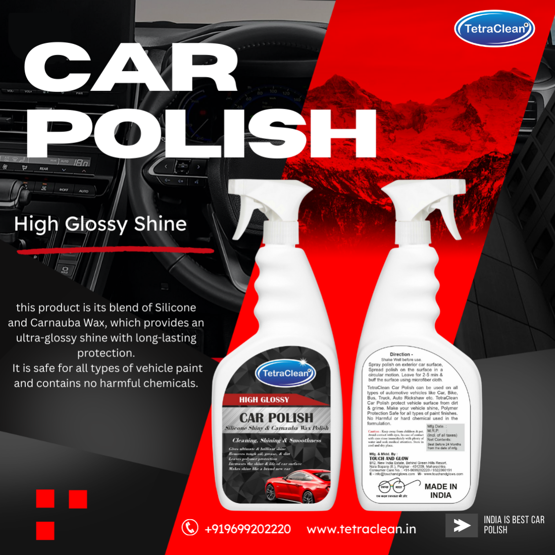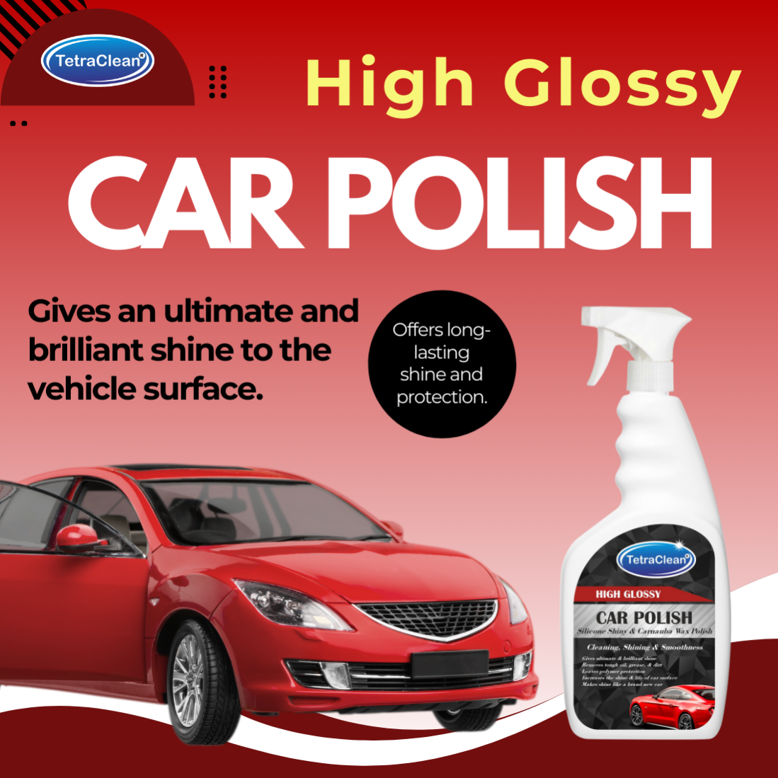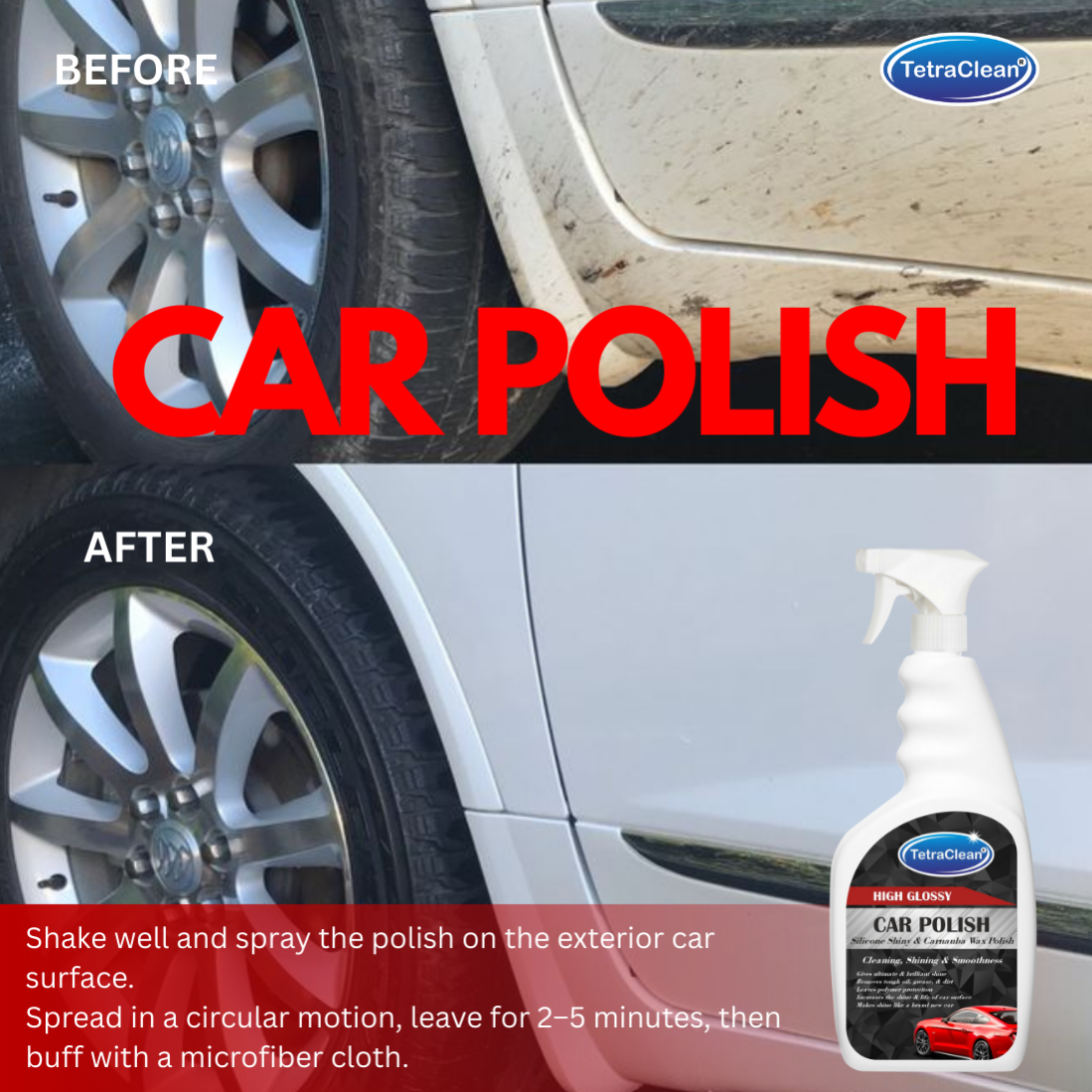 TetraClean High Glossy Car Polish gives your vehicle a brilliant, mirror-like shine with long-lasting protection. Enriched with Silicone and Carnauba Wax, it removes light dirt, dust, and minor stains while restoring smoothness and gloss to all types of vehicle paint.