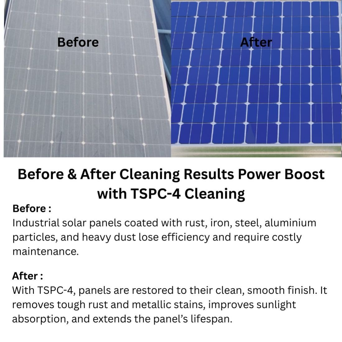 TetraClean TSPC-4 is a heavy-duty solar panel cleaner specially formulated to remove iron, steel, metal, aluminium, rust, and dust particles. Ideal for industrial and manufacturing areas to maintain solar panel efficiency.