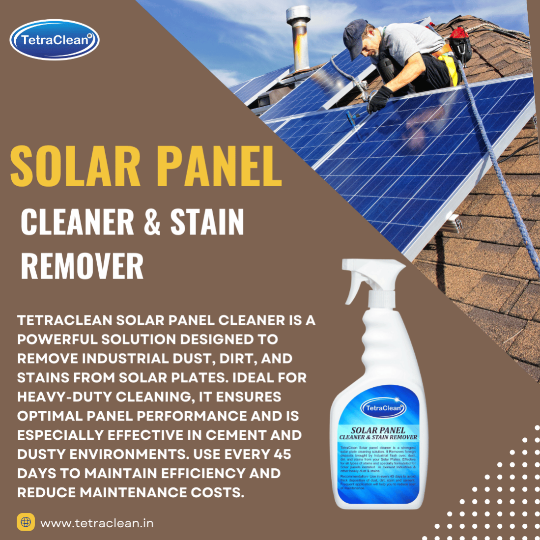TetraClean® Solar Panel Cleaner is a streak-free, non-abrasive cleaning solution designed to remove dust, dirt, bird droppings, and hard-water deposits from solar panels. It enhances light absorption, improves panel efficiency, and leaves a spotless, shiny surface. Safe for all types of solar panels—residential, commercial, and industrial.