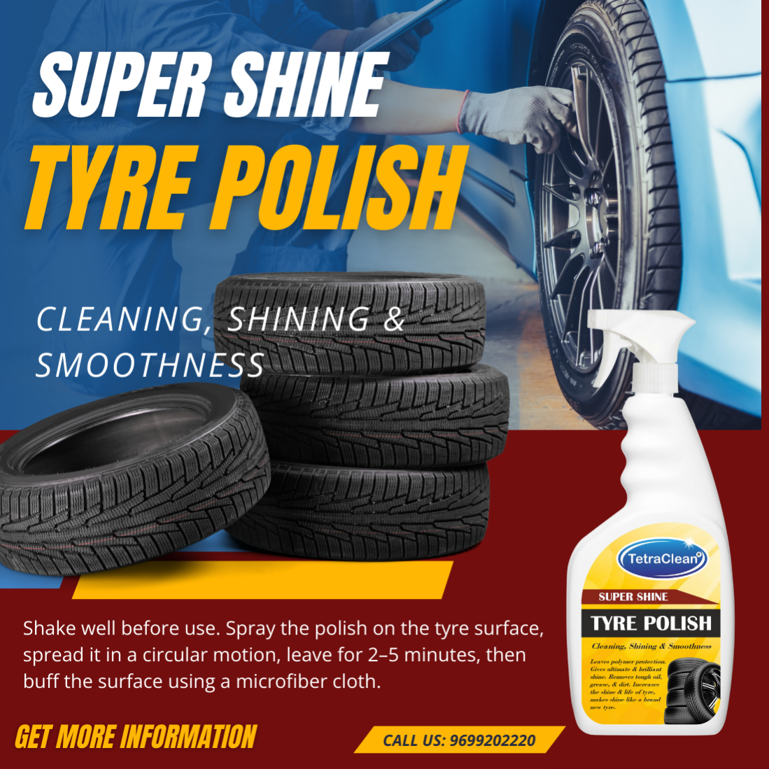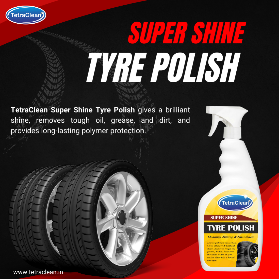 TetraClean Super Shine Tyre Polish restores dull tyres with a brilliant black shine, removes dust and grime, and adds long-lasting polymer protection to keep tyres looking like new. Suitable for cars, bikes, trucks, and more.