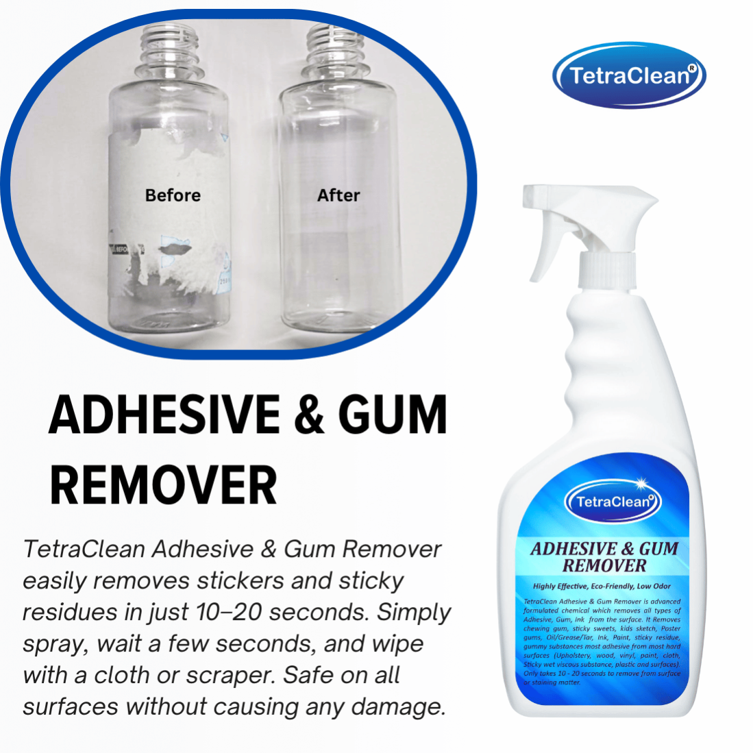 Ideal for household use, offices, schools, cinemas, transportation hubs, hotels, hospitals, and industrial settings, TetraClean Adhesive & Gum Remover removes sticky messes quickly and safely, with a refreshing clean that protects delicate surfaces. Choose TetraClean for effective stain removal, professional-quality results, and peace of mind in every application.