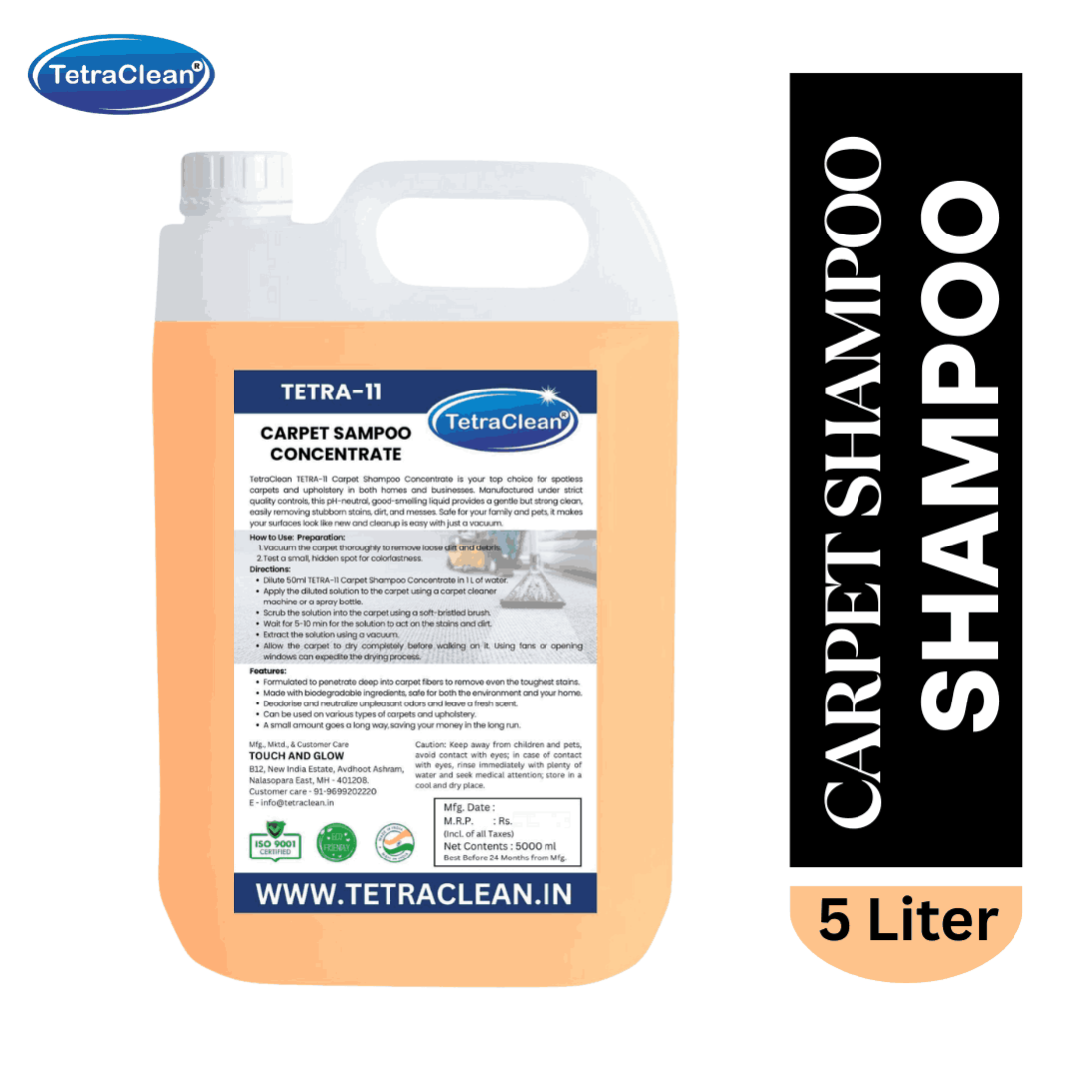 TetraClean TETRA-11 Carpet Shampoo Concentrate is a professional-grade formula designed to deliver spotless, hygienic, and fresh carpets for homes and businesses. Its advanced cleaning agents penetrate deep into carpet fibers, effectively removing dirt, dust, stains, and stubborn grime while being gentle and safe for families, pets, and the environment.