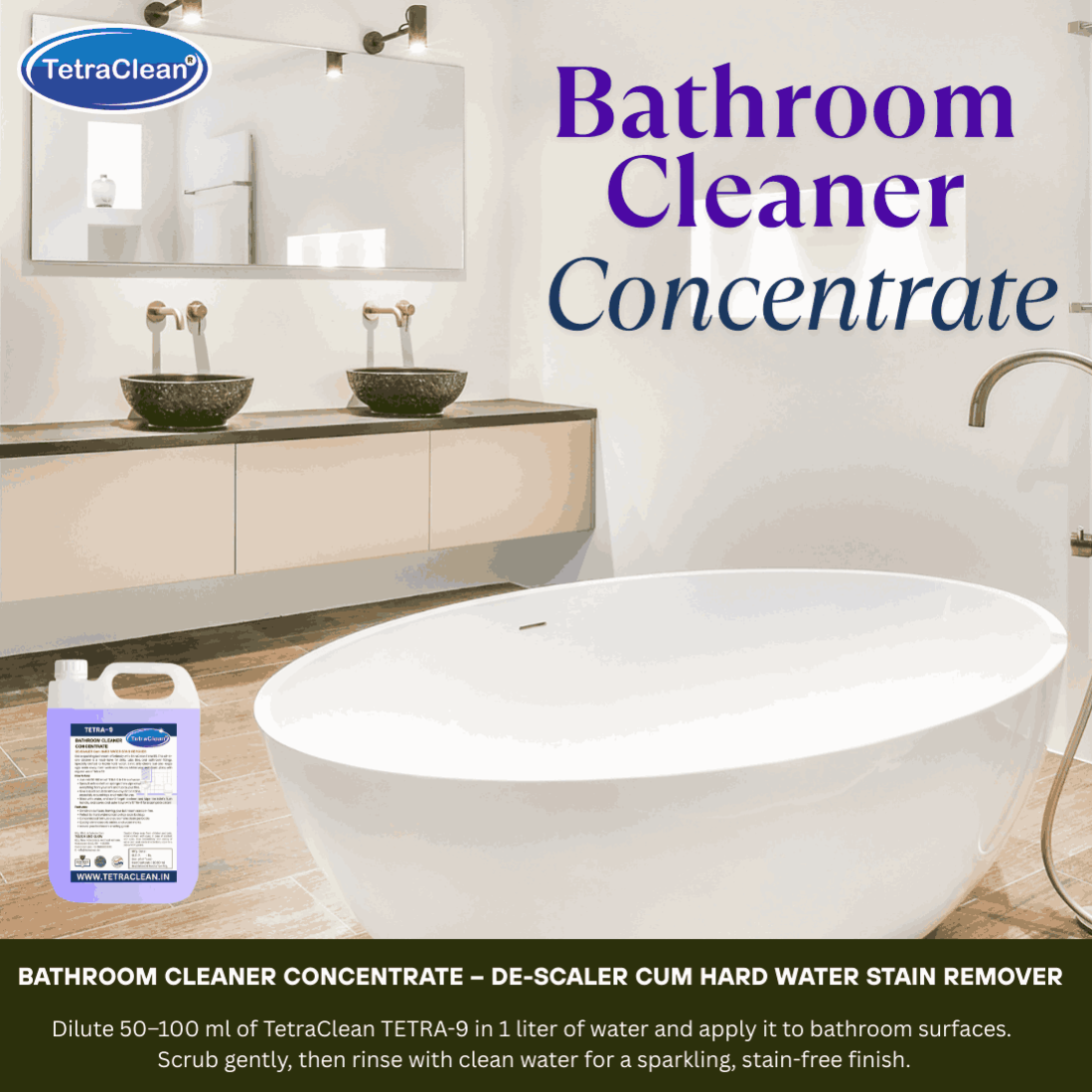 TetraClean TETRA-9 Bathroom Cleaner is a powerful concentrate that removes hard water stains, limescale, and soap scum from tiles, taps, sinks, and fittings. Its scratch-free, fresh-smelling formula ensures a spotless and hygienic bathroom.