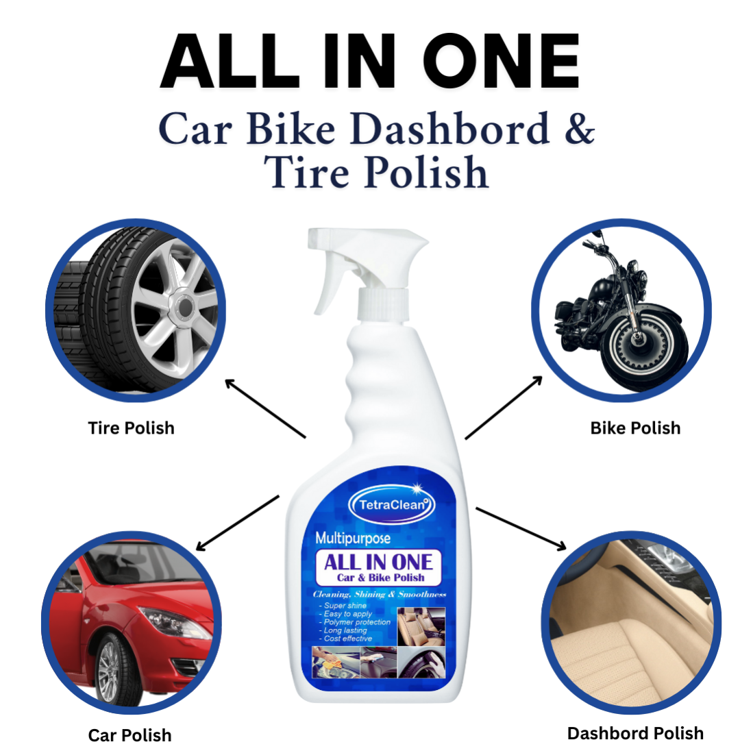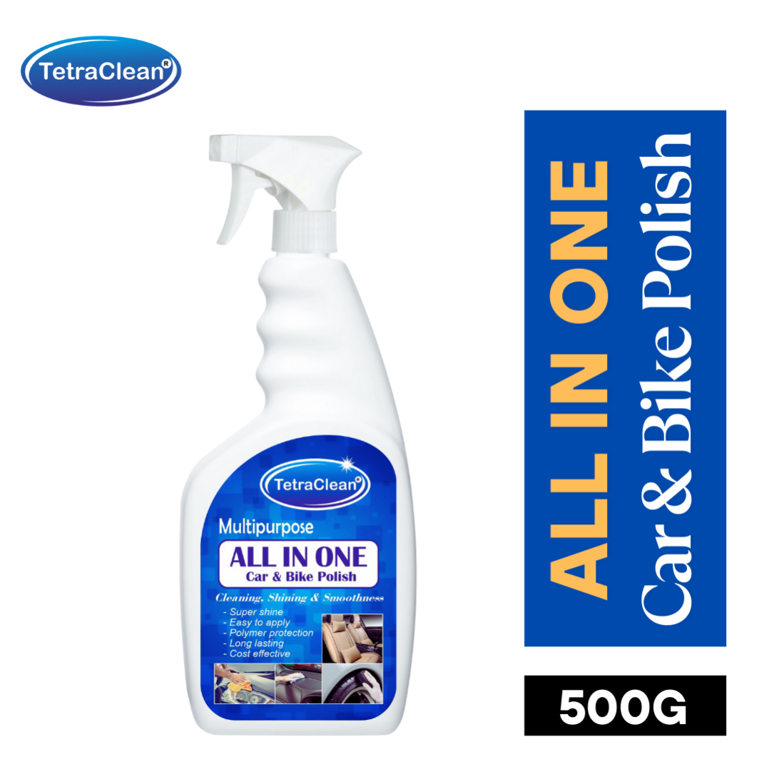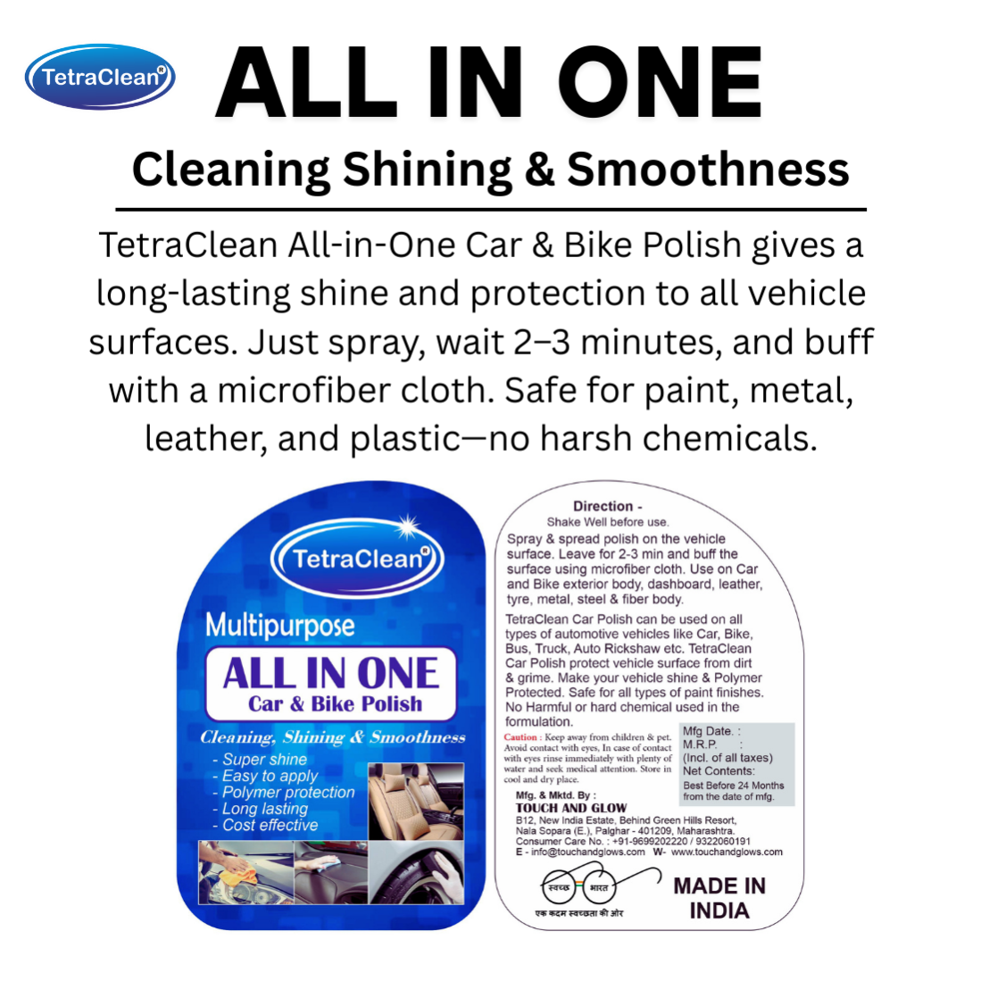 TetraClean All-in-One Car & Bike Polish delivers super shine, smoothness, and long-lasting protection. Safe for paint, metal, leather, tires, and dashboards—just spray, wait, and buff for a showroom finish.