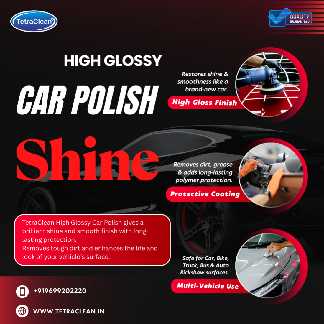 TetraClean High Glossy Car Polish gives your vehicle a brilliant, mirror-like shine with long-lasting protection. Enriched with Silicone and Carnauba Wax, it removes light dirt, dust, and minor stains while restoring smoothness and gloss to all types of vehicle paint.