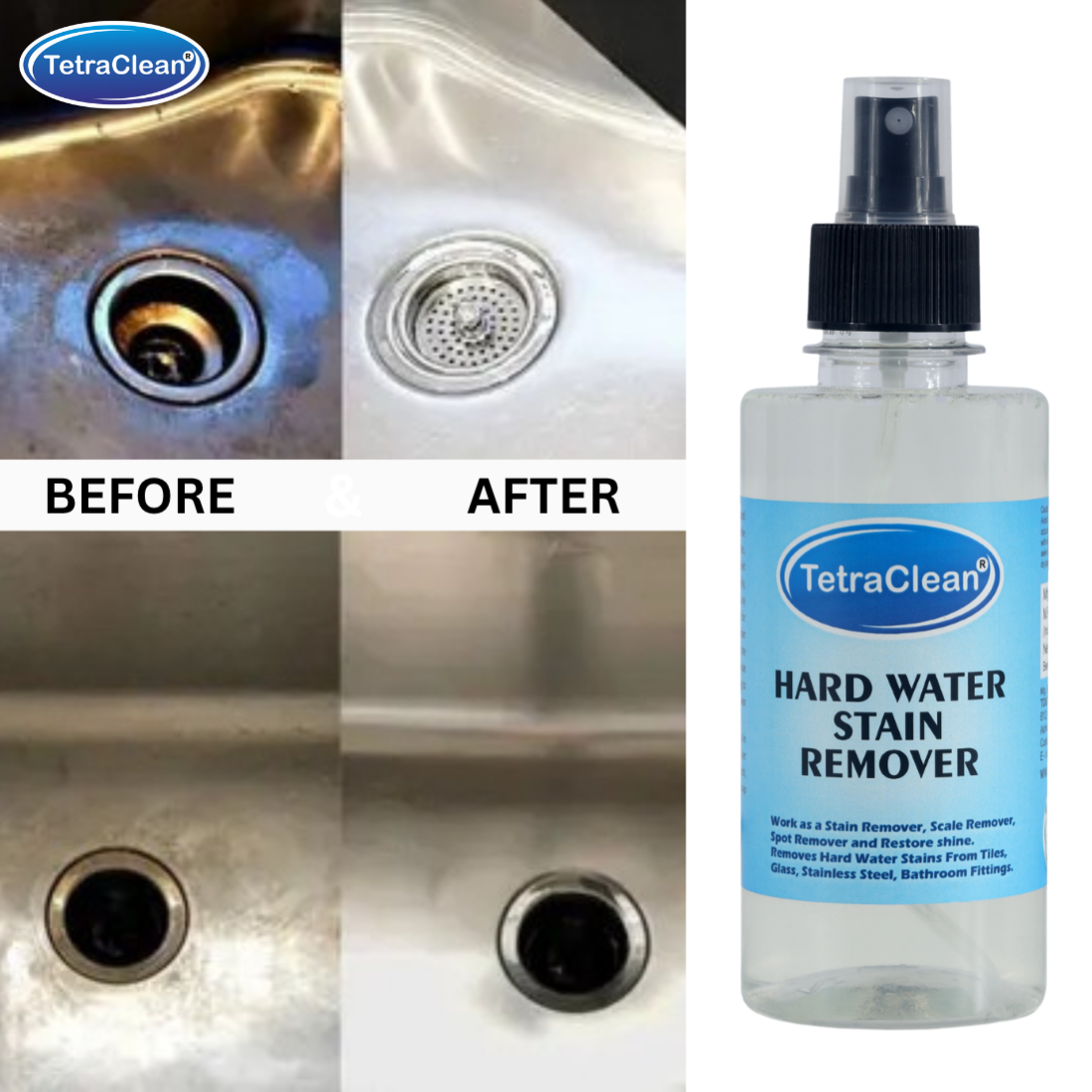 TetraClean Hard Water Stain Remover is a powerful yet safe cleaner specially formulated to eliminate stubborn hard water stains, limescale, calcium deposits, and mineral buildup from glass, tiles, faucets, bathroom fittings, and stainless steel surfaces.