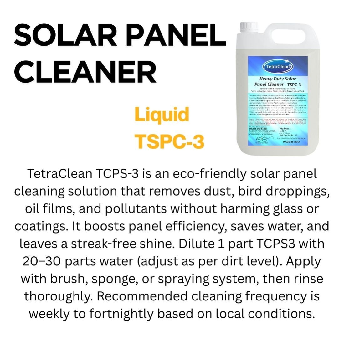 TetraClean TSPC-3 is a heavy-duty solar panel cleaner formulated to remove heavy cement dust, lime dust, hard water stains, bird droppings, chimney dust, and stubborn industrial or natural dust particles. Specially designed for high-pollution areas.