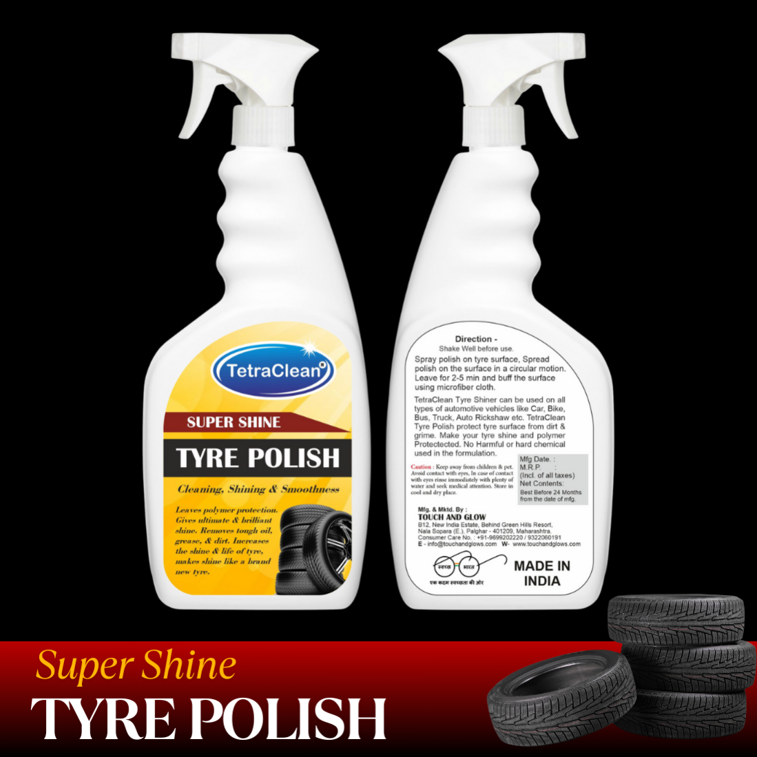 TetraClean Super Shine Tyre Polish restores dull tyres with a brilliant black shine, removes dust and grime, and adds long-lasting polymer protection to keep tyres looking like new. Suitable for cars, bikes, trucks, and more.
