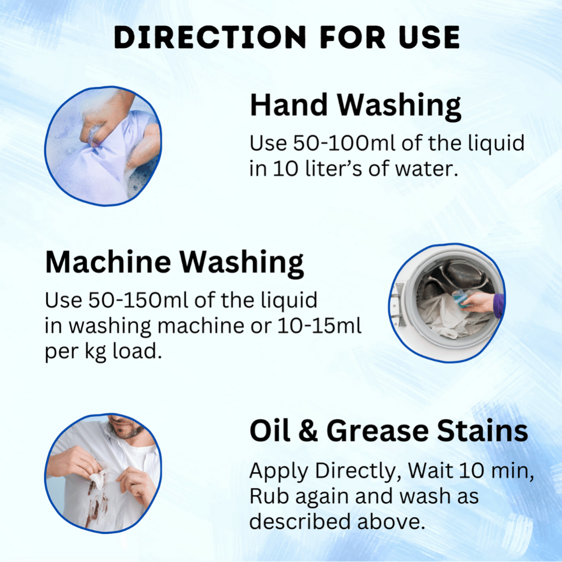 This high-foam, water-transparent liquid is free from harmful chemicals such as Hypochlorite, Sodium Hydroxide, and Acid Slurry, making it safe for regular use on all types of fabrics including cotton, linen, polyester, wool, rayon, and denim.